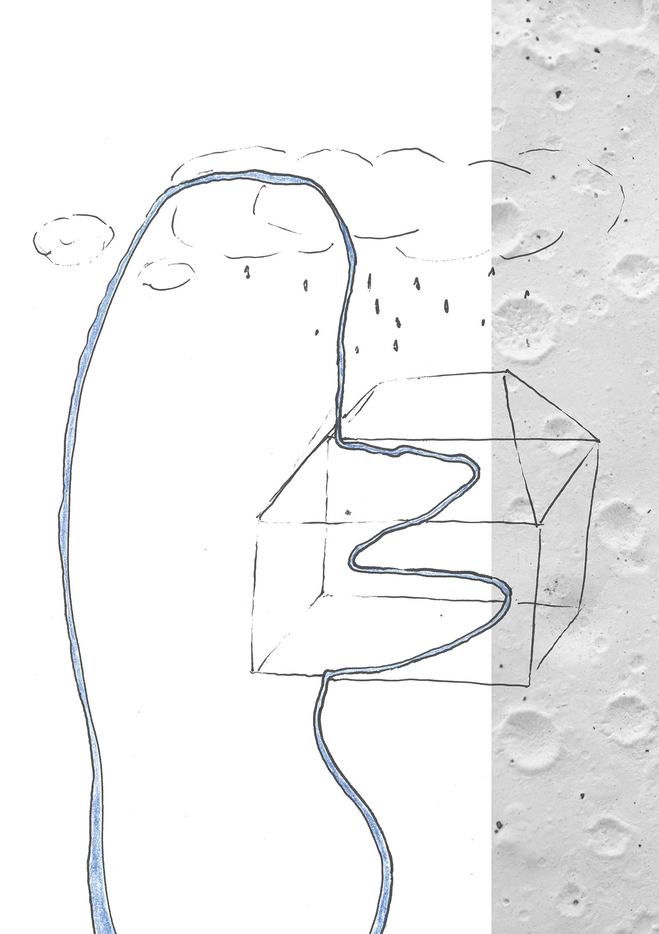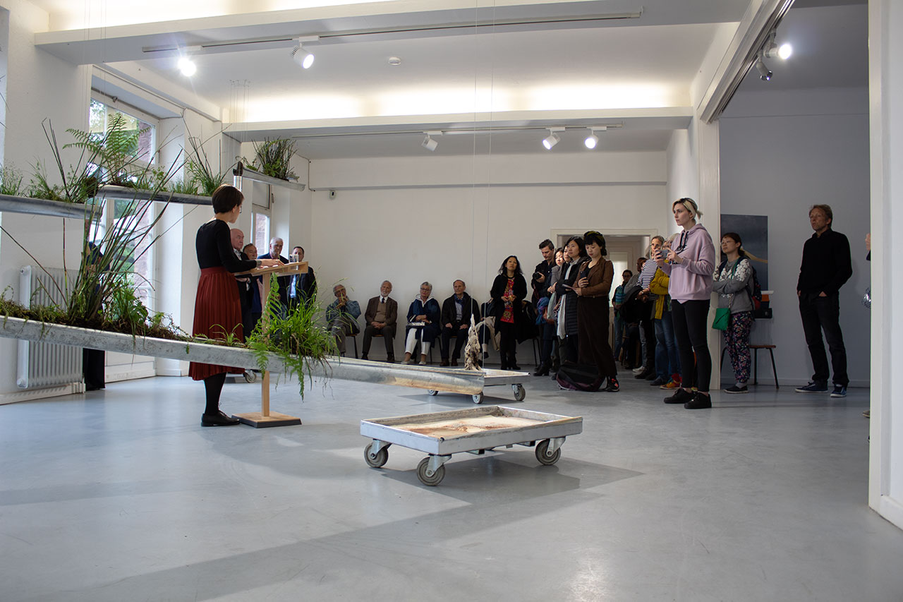 Glas, Moorwasser aus verschiedenen Mooren des Schwarzwaldes, Modellierwachs, Natursteinschlamm, Anorganische Fundstücke der Umgebung Villa Merkel, Siliziumdioxid, Lasercut in Eichenholz, Kalk.